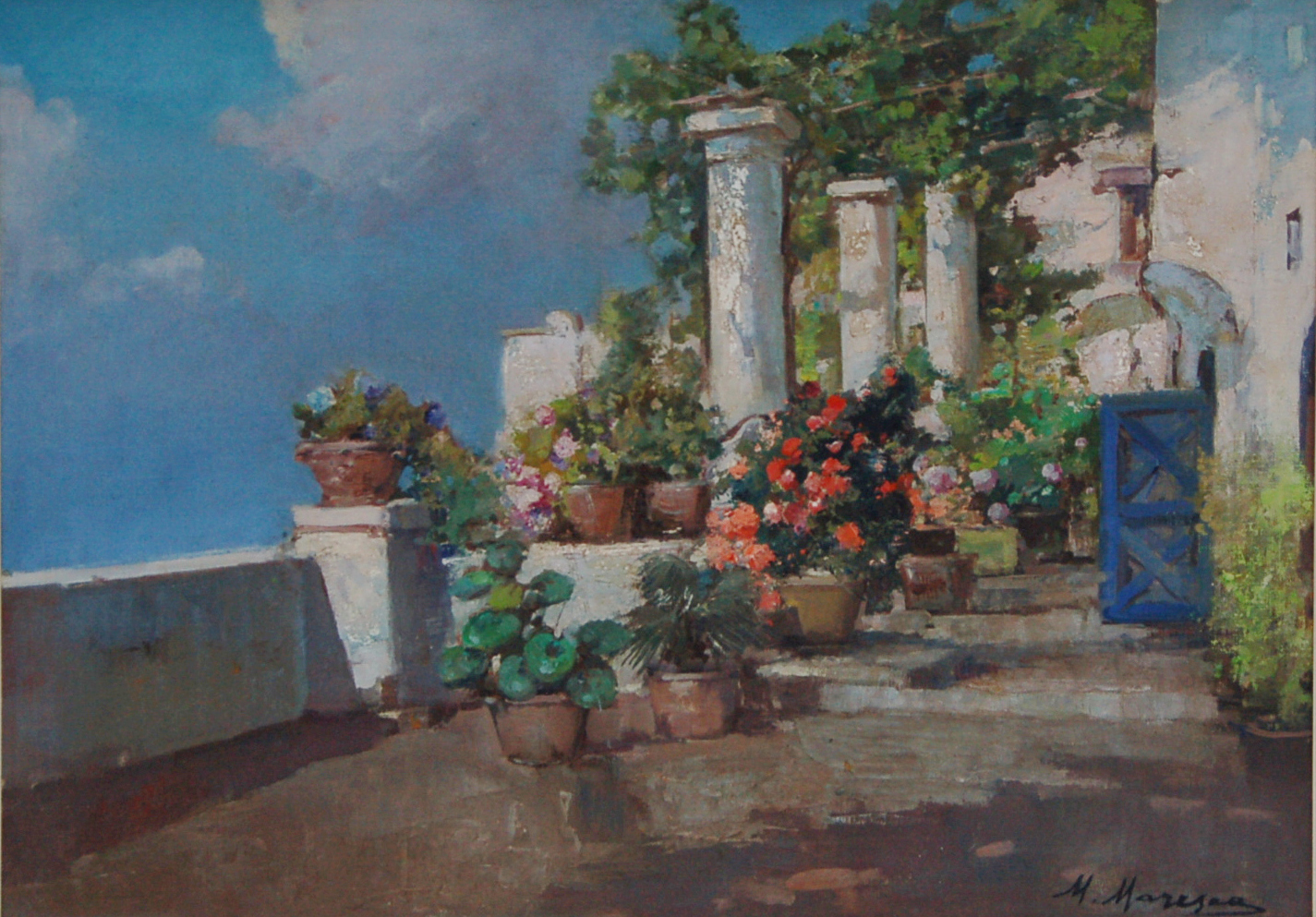 Mario Maresca was an Italian painter born on August 5, 1877, in Naples, Italy. He is best known for his realist paintings and portraits of everyday people in Italy. Maresca studied at the Academy of Fine Arts in Naples, where he honed his skills in painting, drawing, and sculpture. He then went on to study at the Accademia di Belle Arti in Rome, where he was exposed to a wider range of styles and techniques. He was particularly influenced by the works of Caravaggio and the Baroque painters. Maresca’s paintings often depict ordinary people going about their daily lives, such as street vendors, musicians, and farmers. He painted many scenes of the Amalfi coast and this is a typical terrace