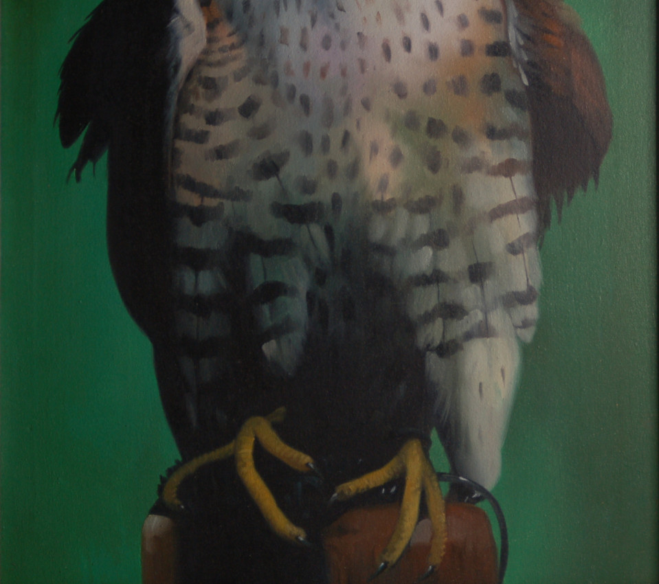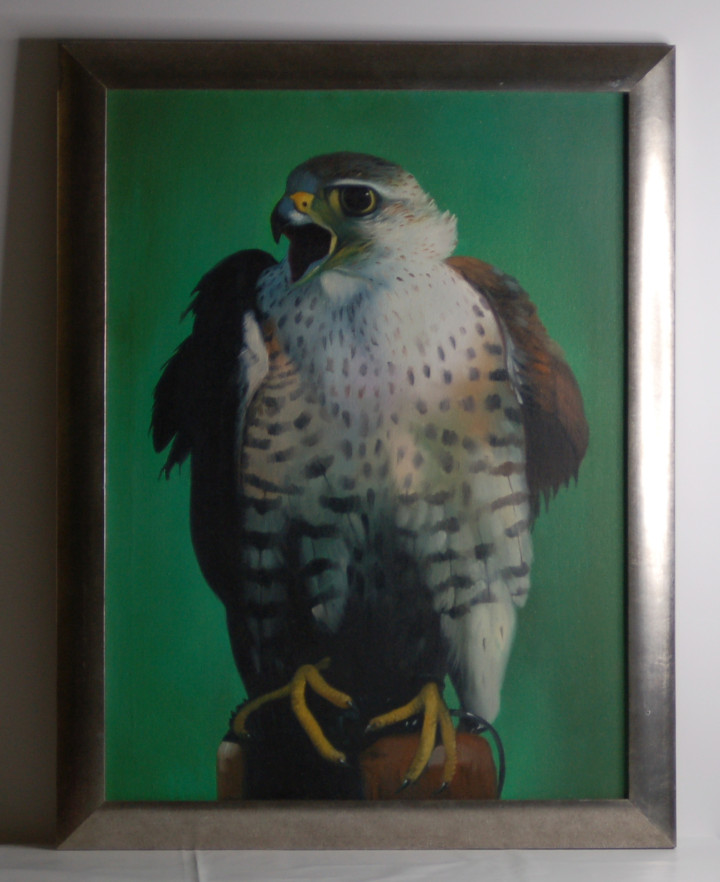 A beautifully painted bird that really captures its essence. Clearly painted to a professional standard with subtle plumage details and use of chiaroscuro. Possibly a saker falcon. As can be seen from anklet and jess, it’s a falconry bird
